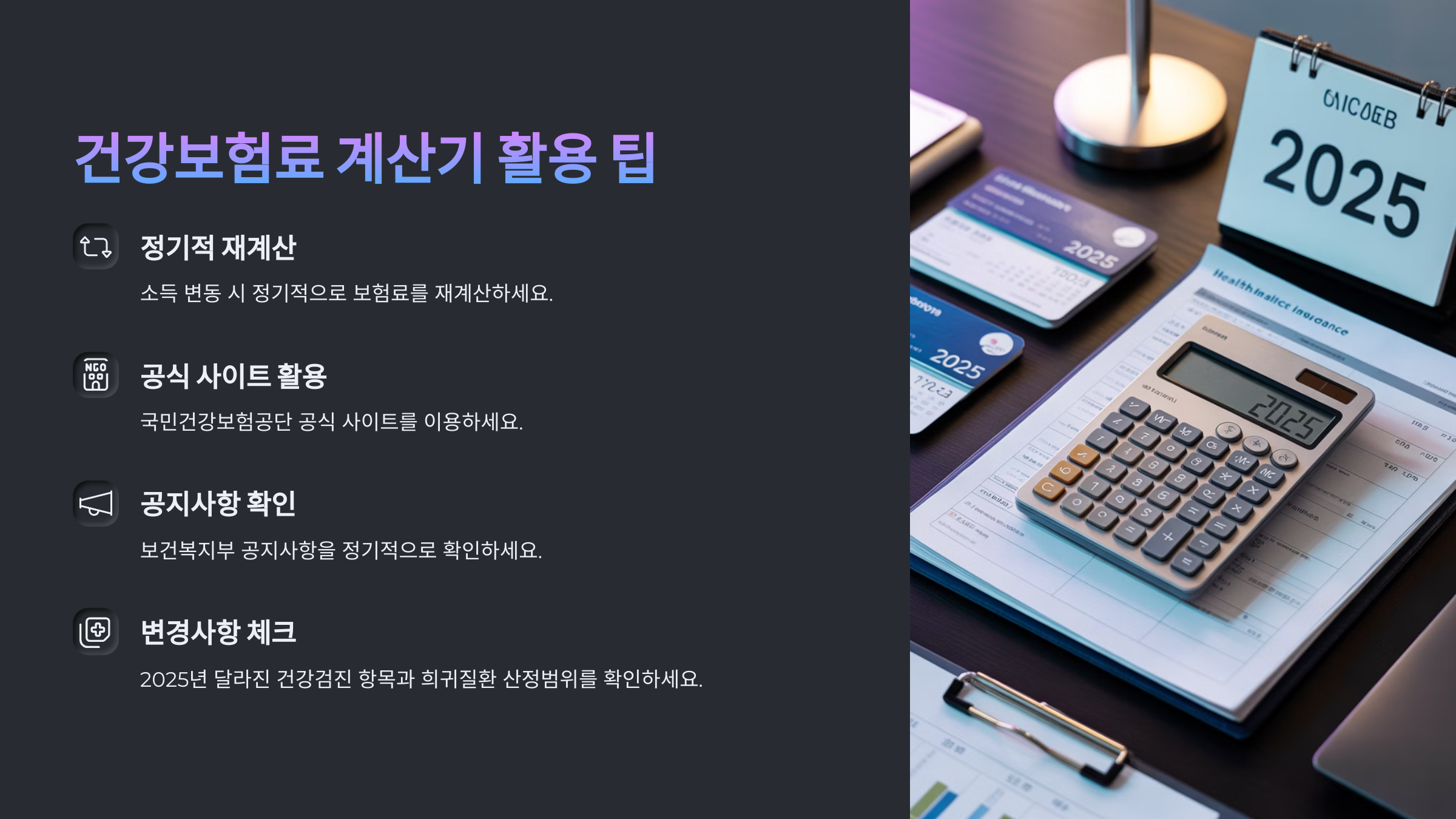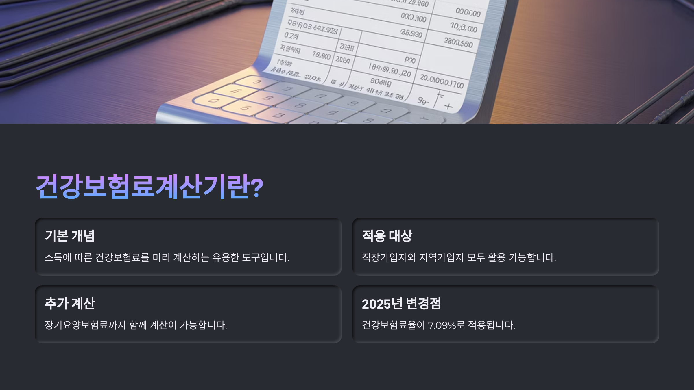 건강보험료계산기는 국민건강보험공단에서 직접 제공하며, 실시간으로 2025년 보험료율을 반영하고 있습니다.