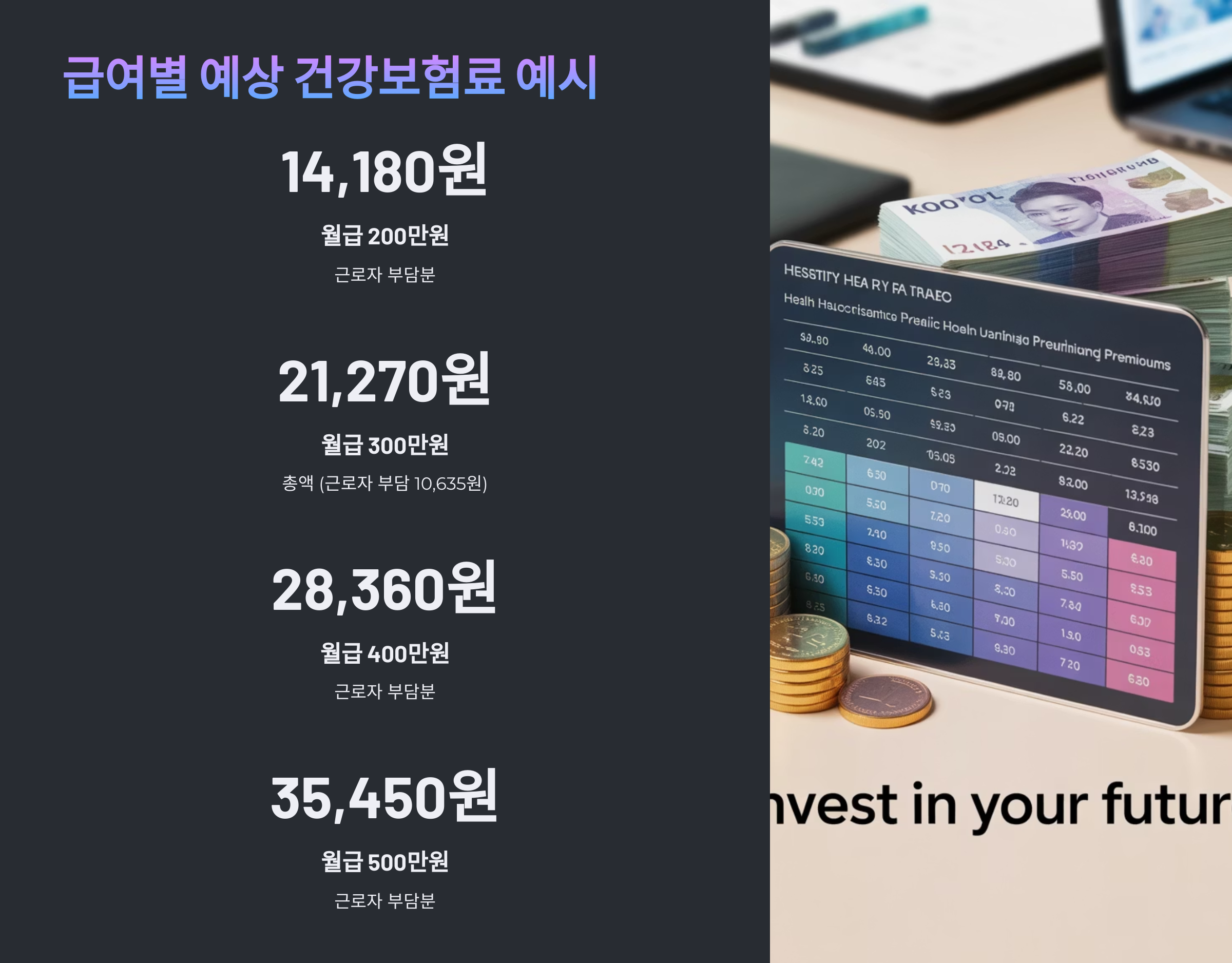 - 월급 400만 원 → 총 보험료 약 29만 9600원 (본인 부담은 절반인 약 14만 9800원)