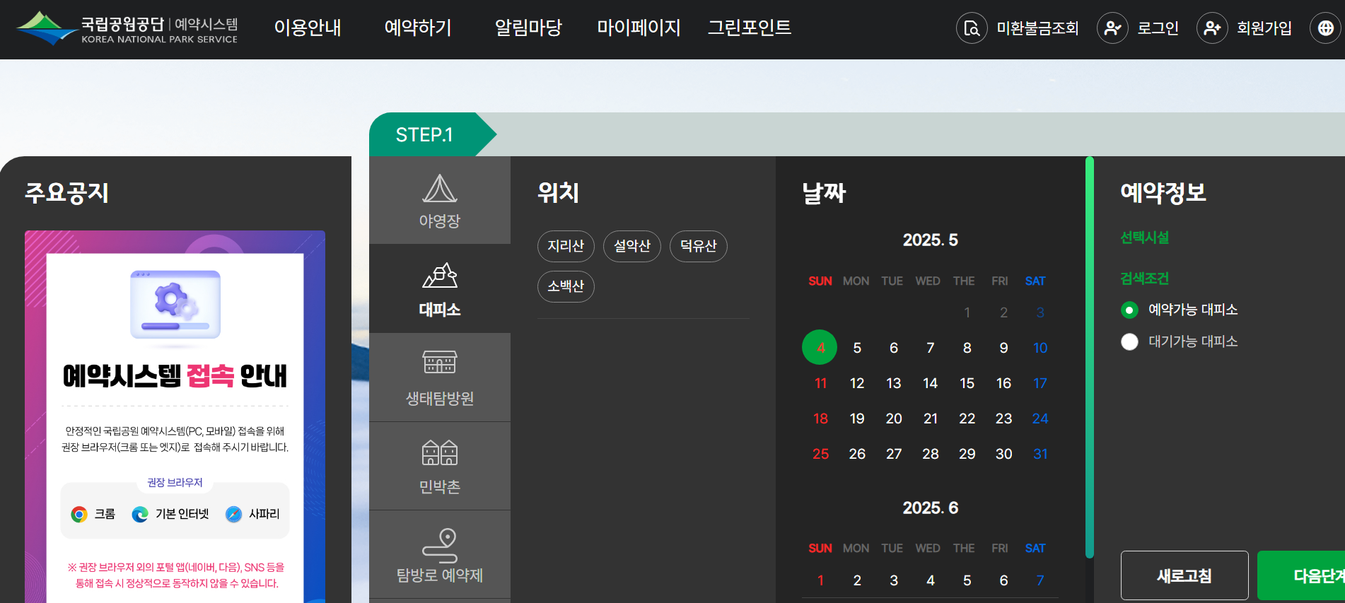 - 국립공원예약 통합 시스템 접속: https://reservation.knps.or.kr/