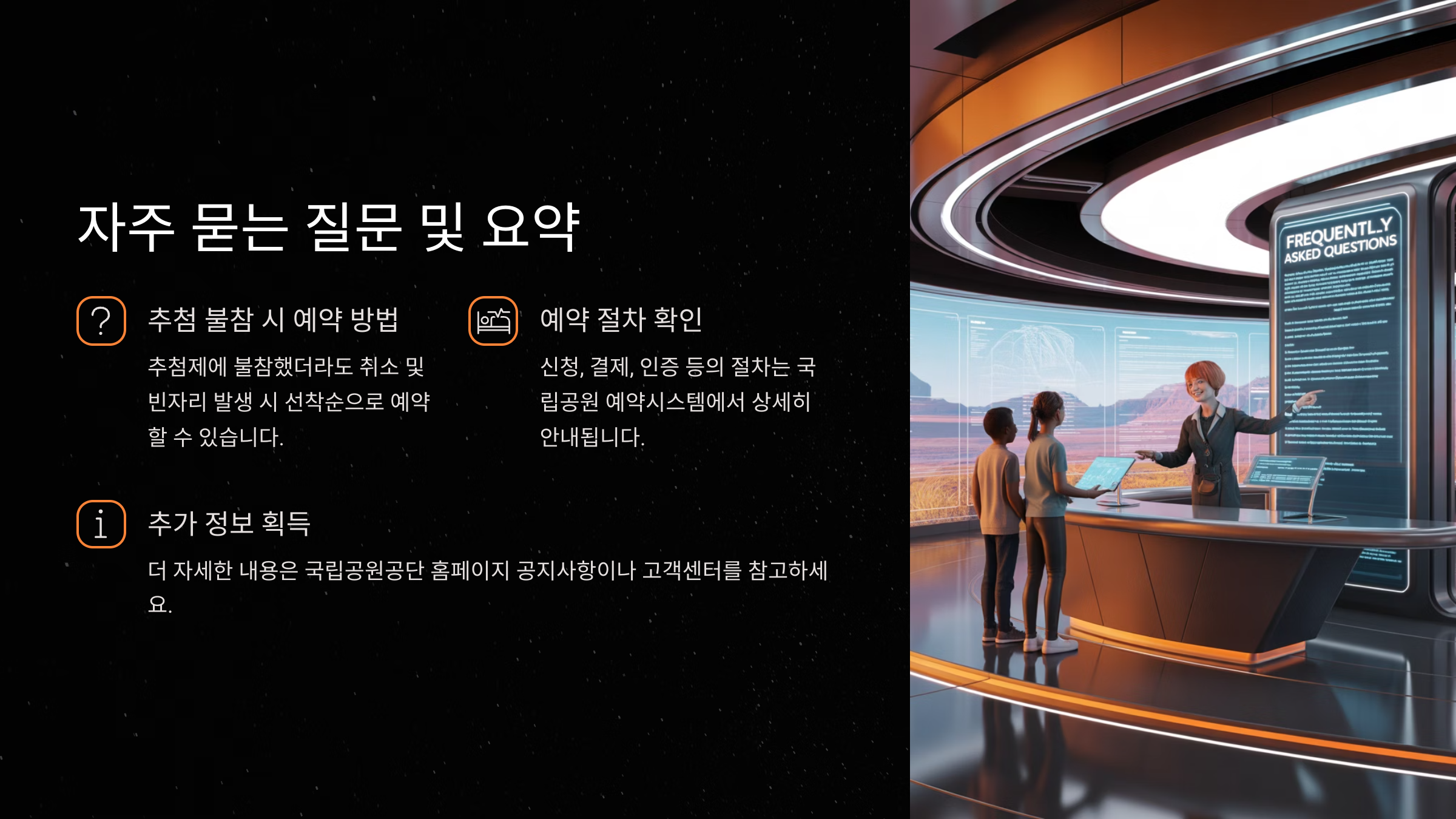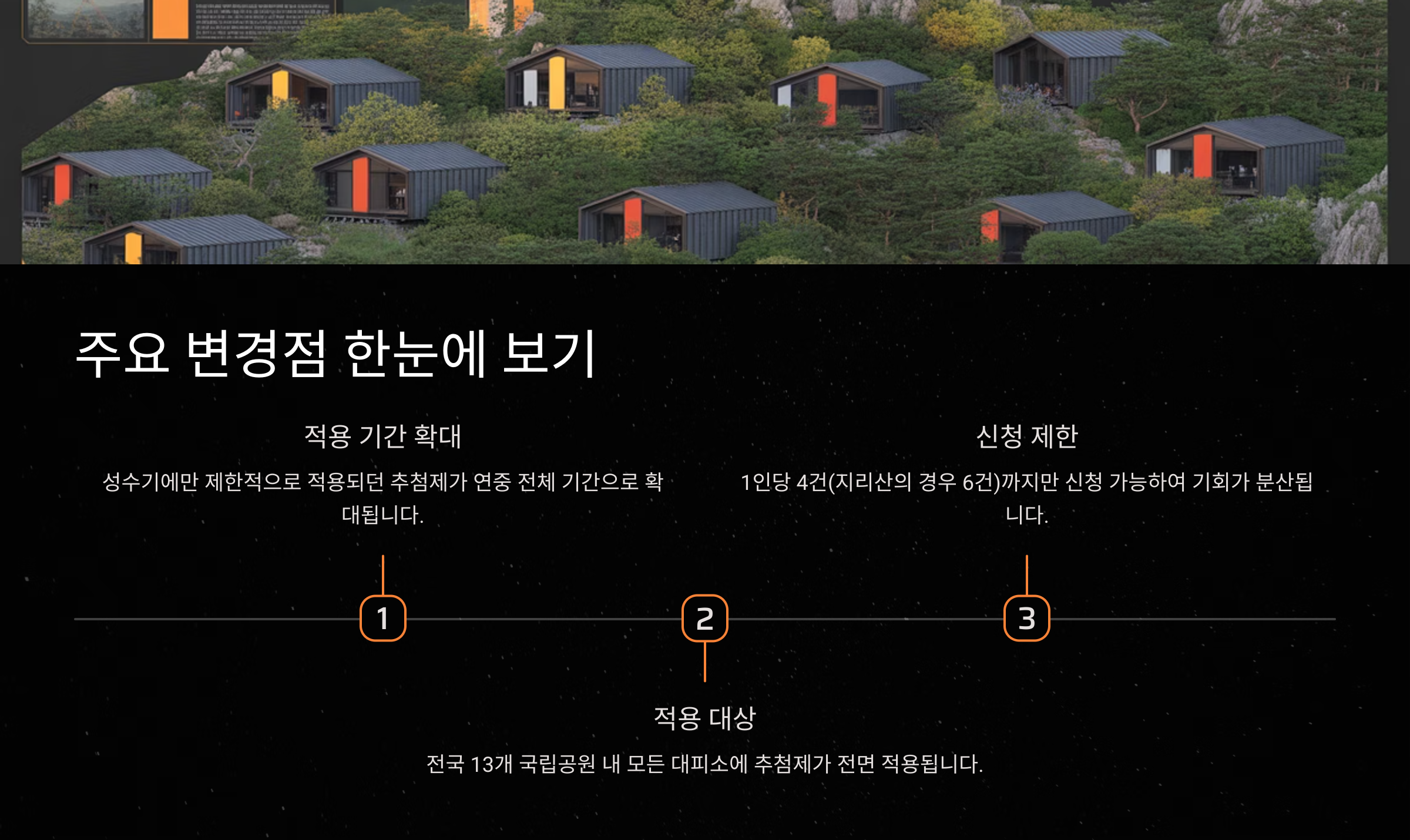 국립공원예약 통합 시스템의 추첨제 도입은 탐방객들에게 더 나은 예약 환경을 제공하기 위한 변화입니다. 공정하고 효율적인 예약을 위해 국립공원예약 통합 시스템을 적극 활용하시기 바랍니다.