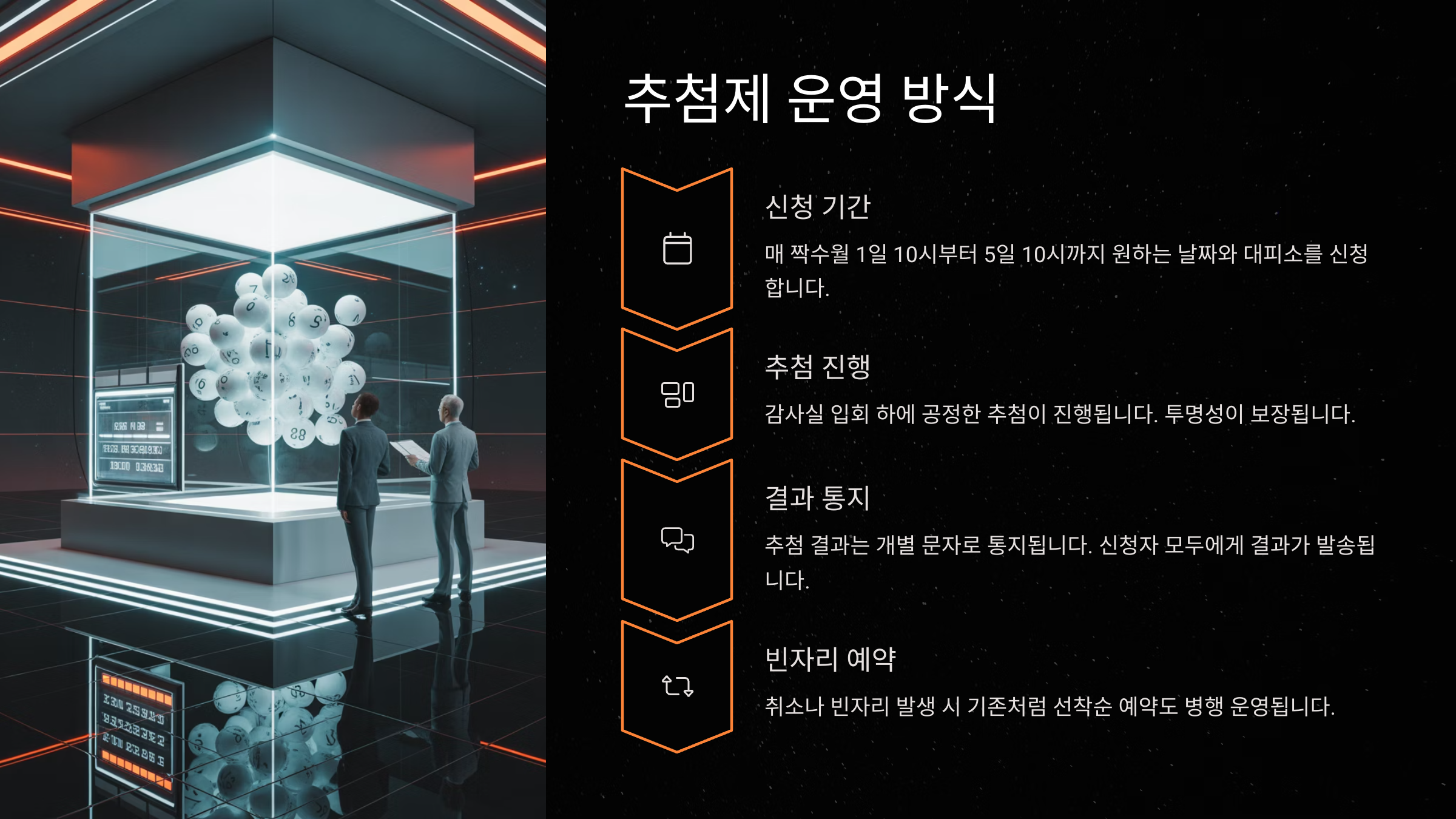- 추첨 신청 기간 확인: 매 짝수월 1일 오전 10시부터 5일 오전 10시까지