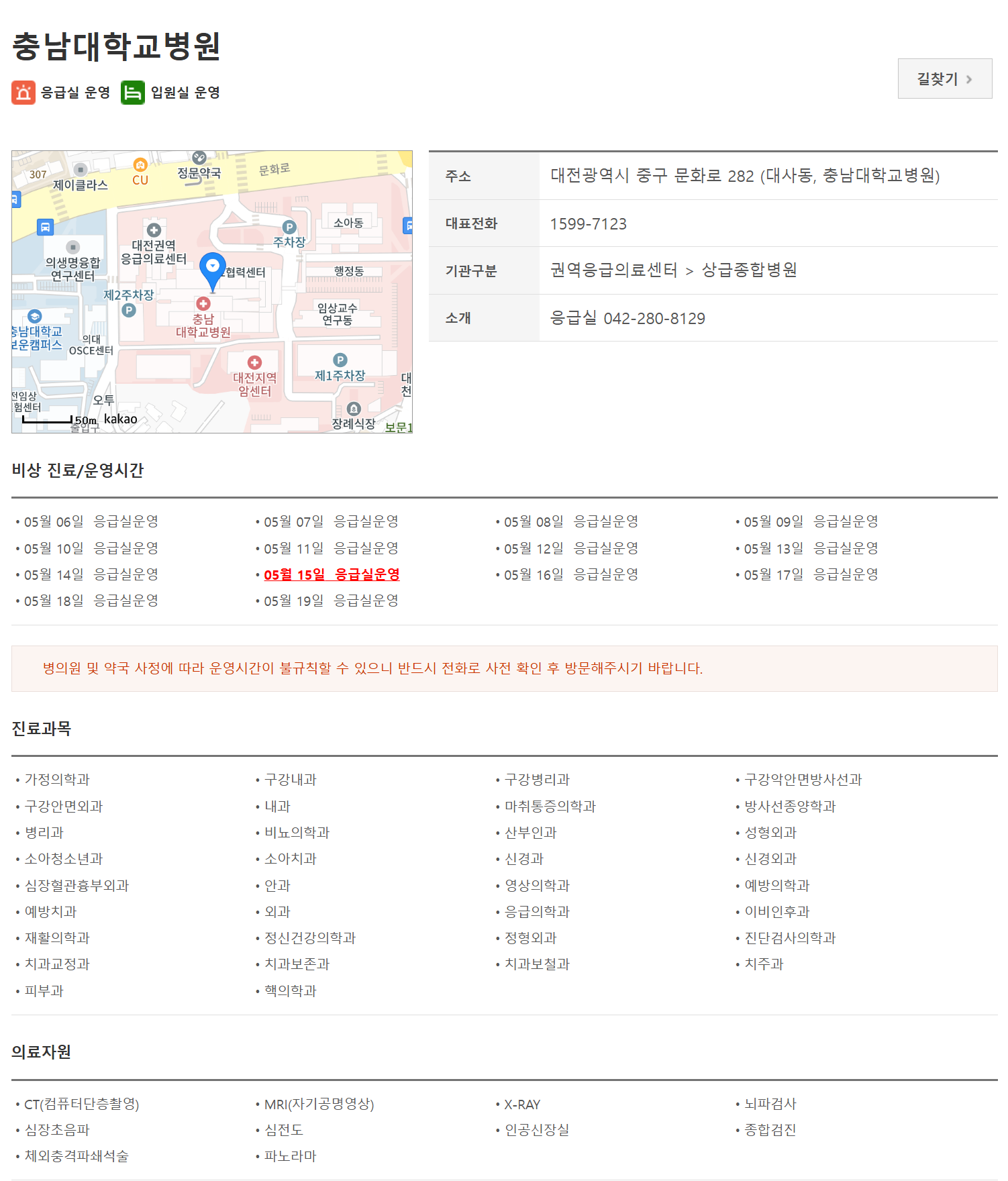 충남대학교병원은 대전에서 주말 문여는 병원 중 가장 큰 규모를 자랑합니다. 365일 응급실확인이 가능하며, 중증 질환자도 안심하고 방문할 수 있습니다. 일요일 진료병원 중에서도 모든 진료과목확인이 가능한 종합병원입니다.