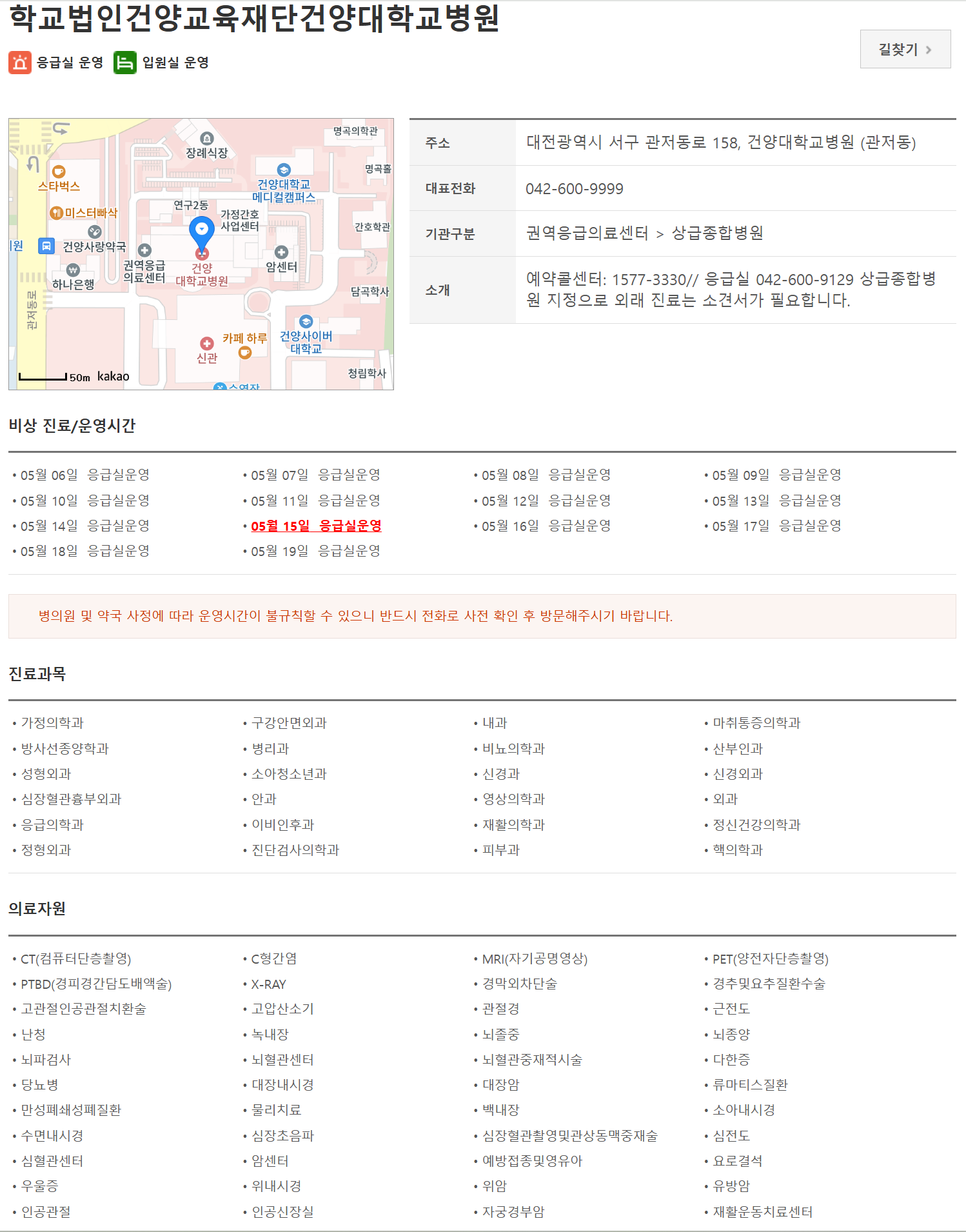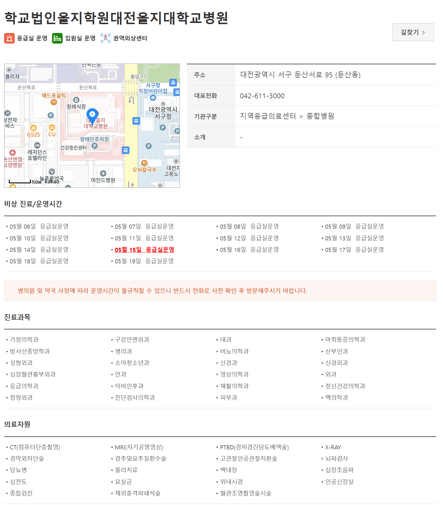 위치확인 | 24시간 | 전과목 | 가능 | 가능 | 권역외상센터 운영 |