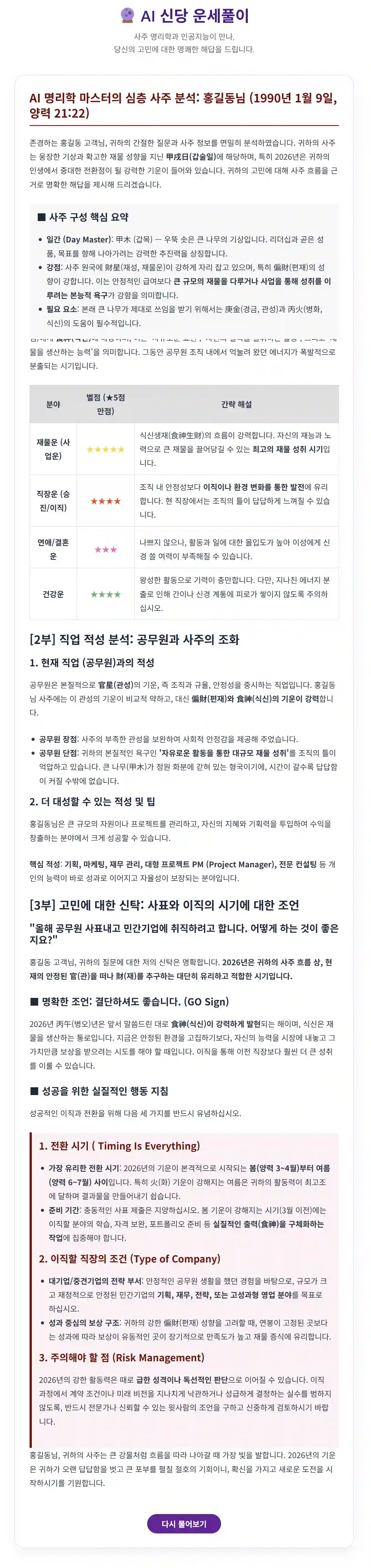 - 동기 유발: "오늘은 AI에게 내 2026년 운명을 물어볼까요?"라며 흥미를 돋웁니다.