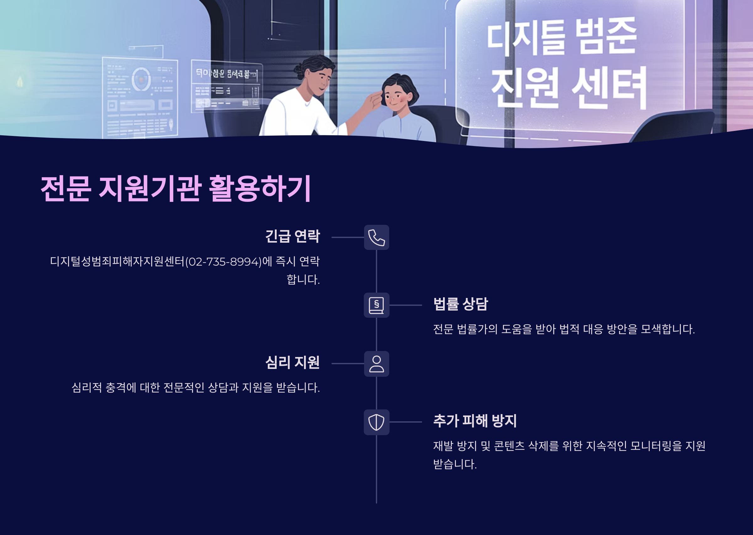 - 디지털 성범죄 피해자 지원센터: 24시간 상담 가능