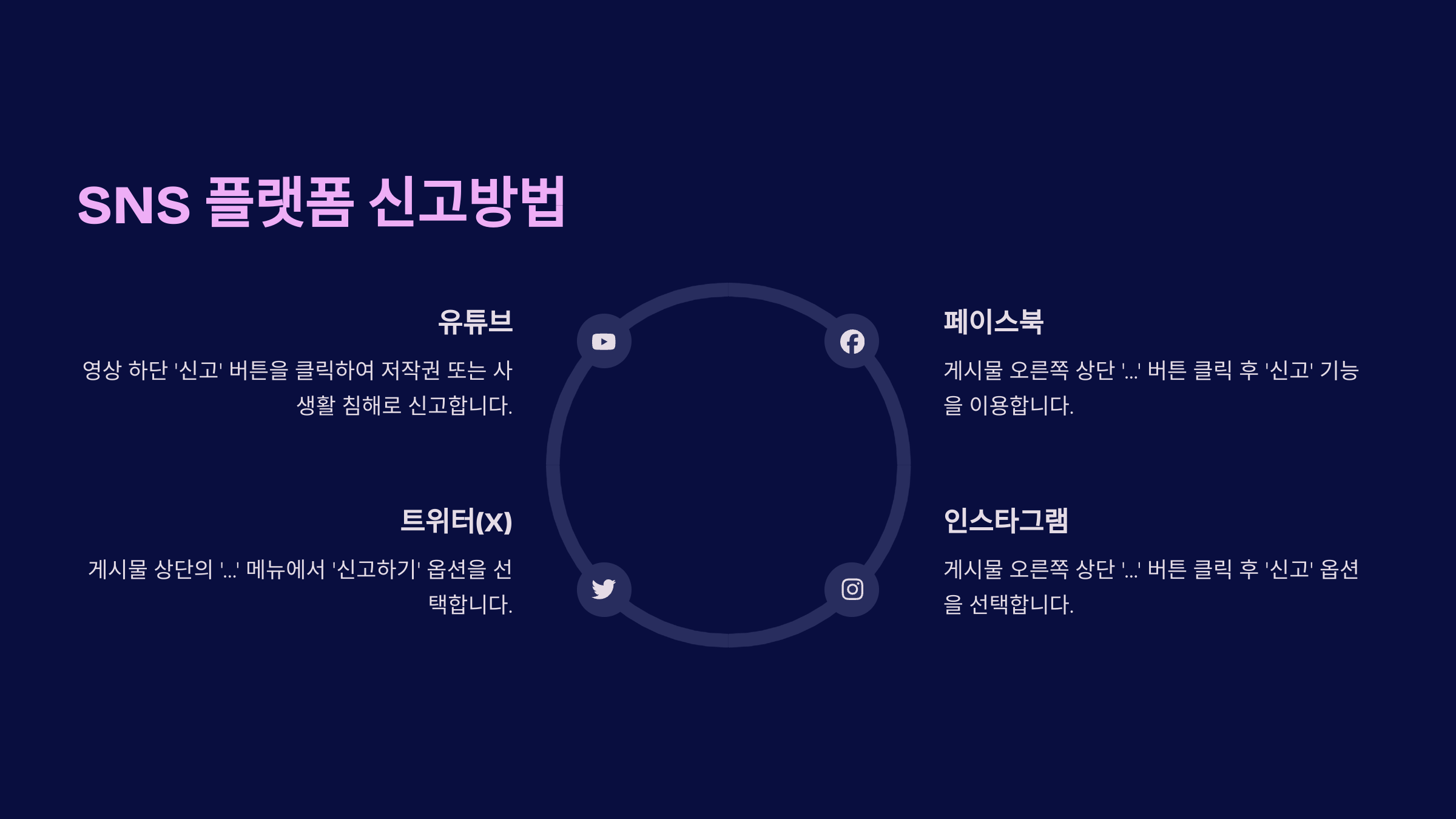 - 유튜브, 인스타그램, 트위터 등 대부분의 플랫폼은 자체 신고 시스템을 운영 중입니다.