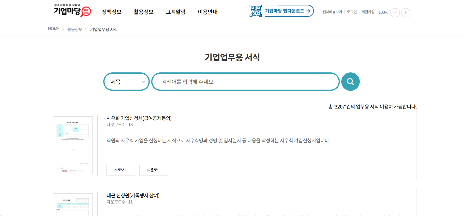 중소벤처기업부 중소벤처기업연구원에서 제공하는 무료 양식은 스마트폰 앱 설치하여 다운받기도 가능합니다.