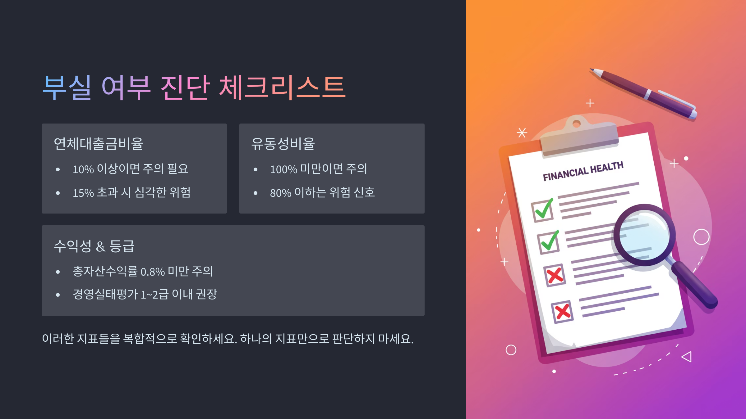 - 대출채권 현황: 기업 자금 대출 비율이 낮을수록 좋음
