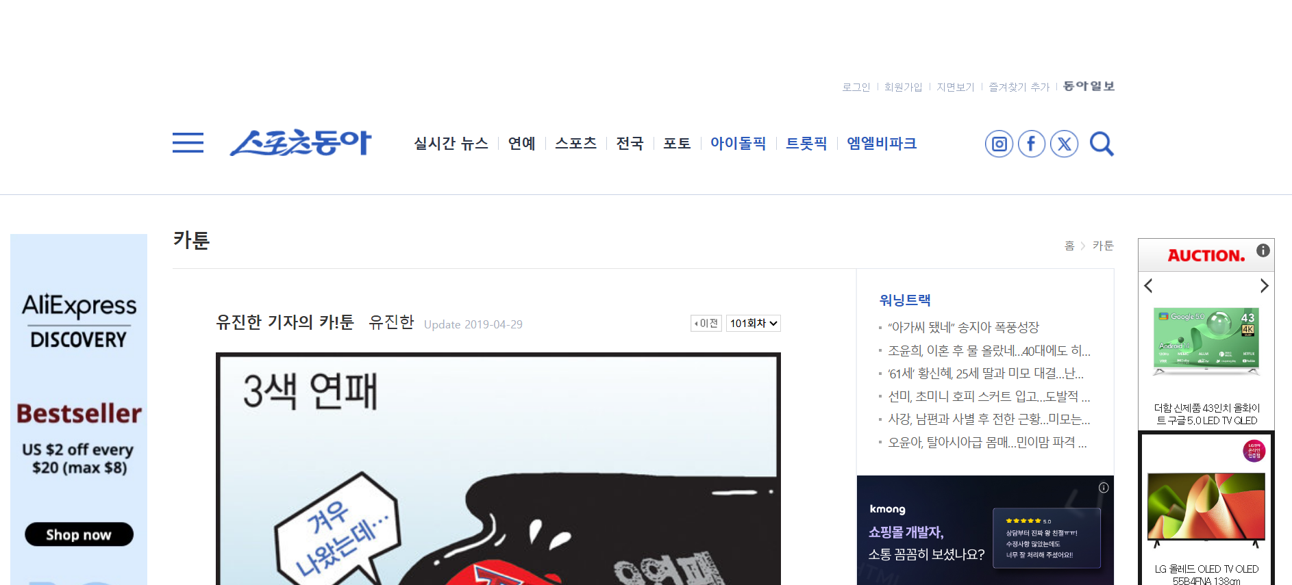 - 특징: 스포츠동아는 유진한 기자의 '카툰'을 통해 사회 이슈를 풍자하는 만화를 제공합니다.