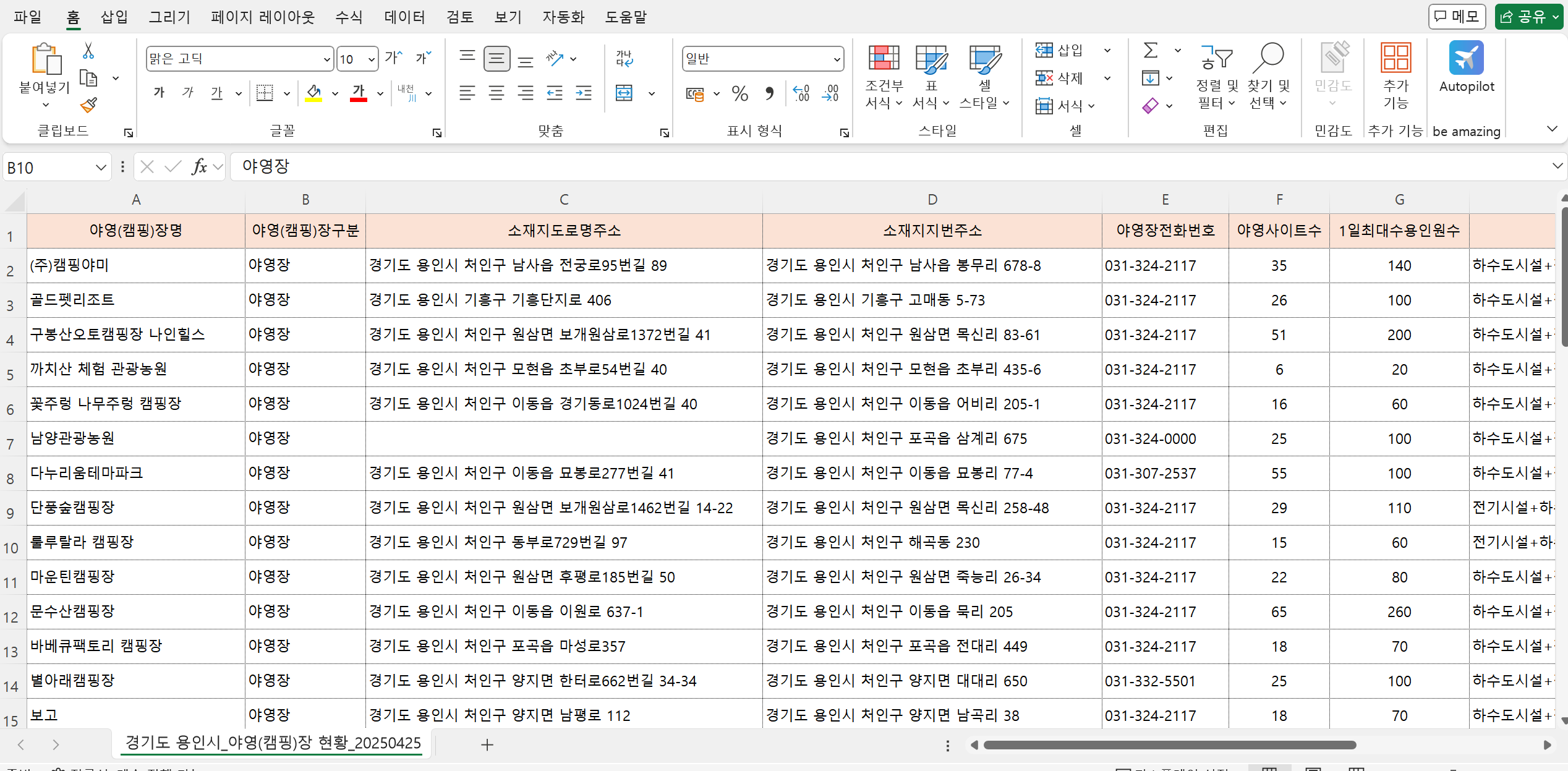 용인시 글램핑 캠핑장 51곳의 상세 정보가 담긴 파일은 공공데이터 포털에서 다운로드할 수 있습니다. 이 파일에는 각 캠핑장의 위치, 연락처, 시설 정보 등이 포함되어 있어 캠핑 계획 시 유용하게 활용할 수 있습니다.