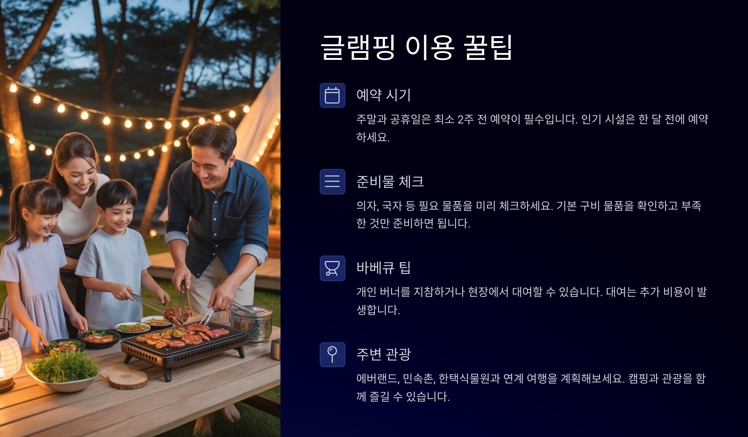 - 각 용인시 글램핑 캠핑장마다 예약 방식과 규정이 다를 수 있으니 반드시 확인하세요.