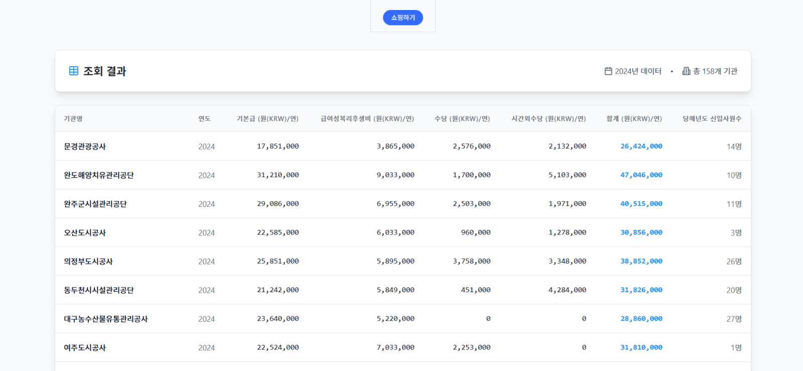 지방공기업 신입사원 임금 연봉 급여 조회 서비스를 소개합니다. 이 무료 웹서비스는 정부 공개 데이터를 기반으로 160여 개 지방공기업의 신입사원 기본급, 복리후생비, 수당, 시간외수당, 신입사원 수 등을 ‘연도와 기관명’만 입력해 한눈에 확인할 수 있습니다. 특히 청년 구직자나 진로상담자에게 유용한 자료입니다. 지방공기업 신입사원 임금 연봉 급여 조회는 취업전략 수립에 도움되며, 지방공기업 신입사원 임금 연봉 급여 조회 화면에서 실시간 데이터를 제공합니다. 지방공기업 신입사원 임금 연봉 급여 조회를 통해 정확한 정보를 얻을 수 있으며, 지방공기업 신입사원 임금 연봉 급여 조회 결과를 즉시 확인할 수 있습니다.