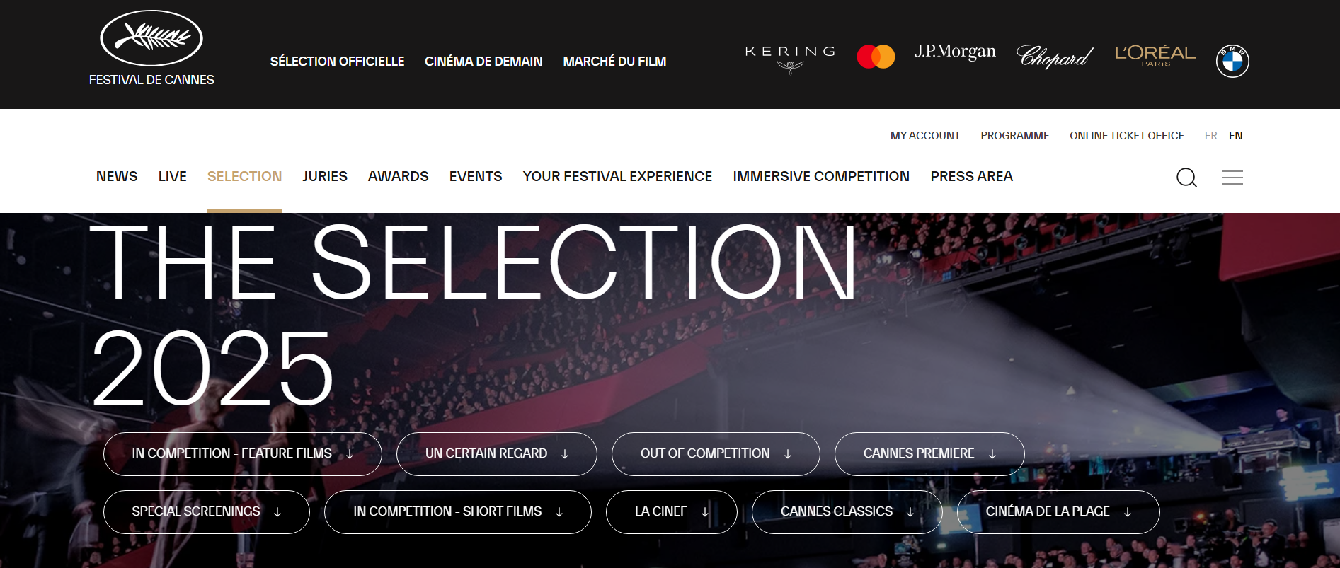칸 영화제 공식 홈페이지의 Selection 메뉴에서는 올해의 주요 상영작 정보를 가장 빠르고 정확하게 확인할 수 있습니다.