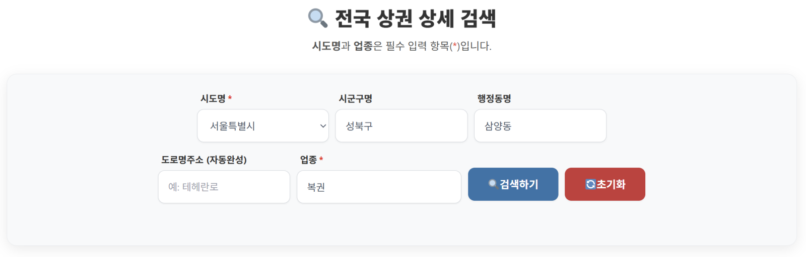 STEP 2. 지역 및 업종 검색 메인 화면 검색창에 창업 희망 **지역(동 단위)**과 업종을 입력합니다.