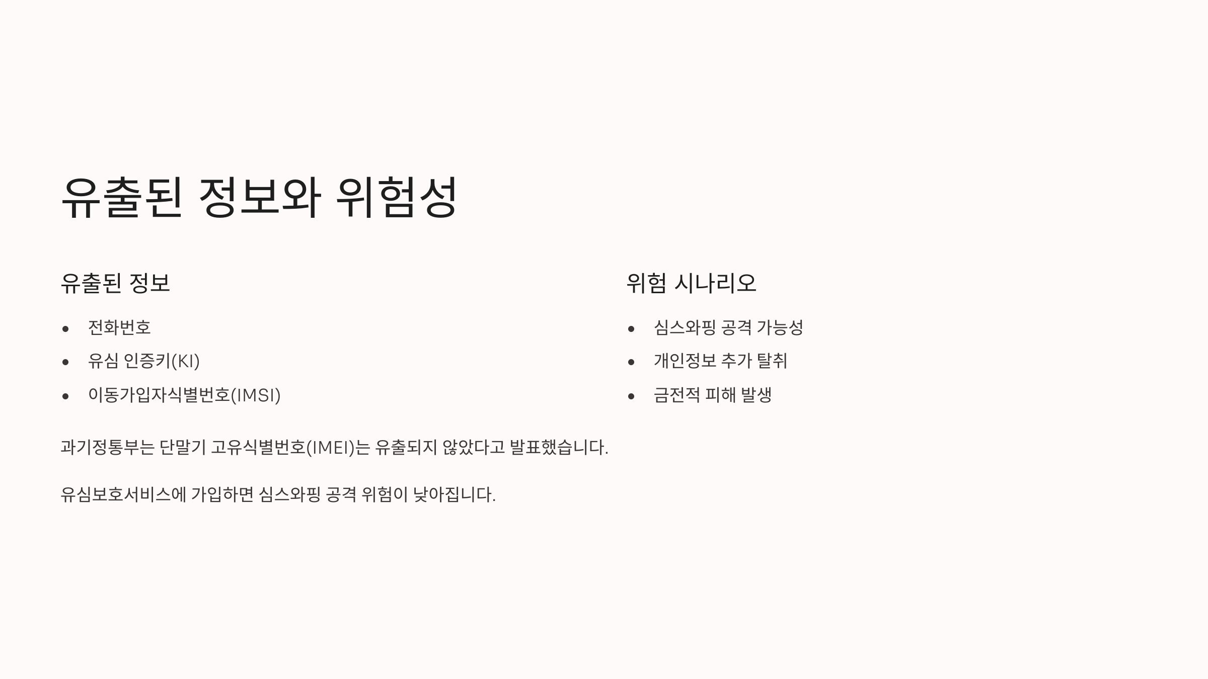 - 유심 복제 공격(SIM Swapping): 해커가 유출된 정보로 유심을 복제하여 본인 인증 문자를 가로챌 수 있습니다.