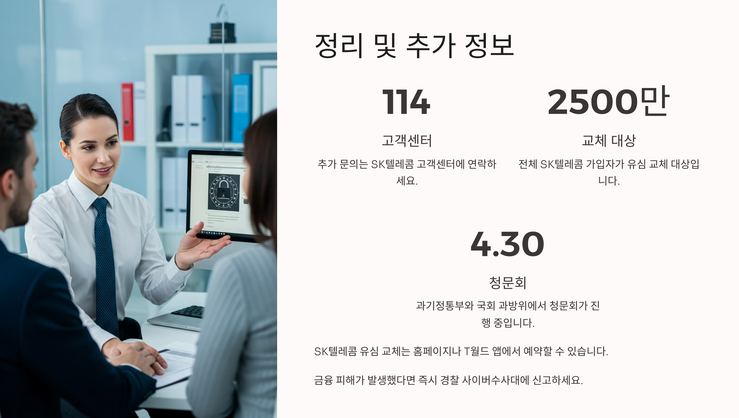SK텔레콤은 추가적인 보안 조치와 피해 보상 방안을 마련하고 있으니, 공식 채널을 통해 업데이트되는 정보를 확인하시기 바랍니다. 무엇보다 개인정보 보호와 보안에 대한 경각심을 가지고 일상에서의 디지털 보안을 철저히 하는 것이 중요합니다.