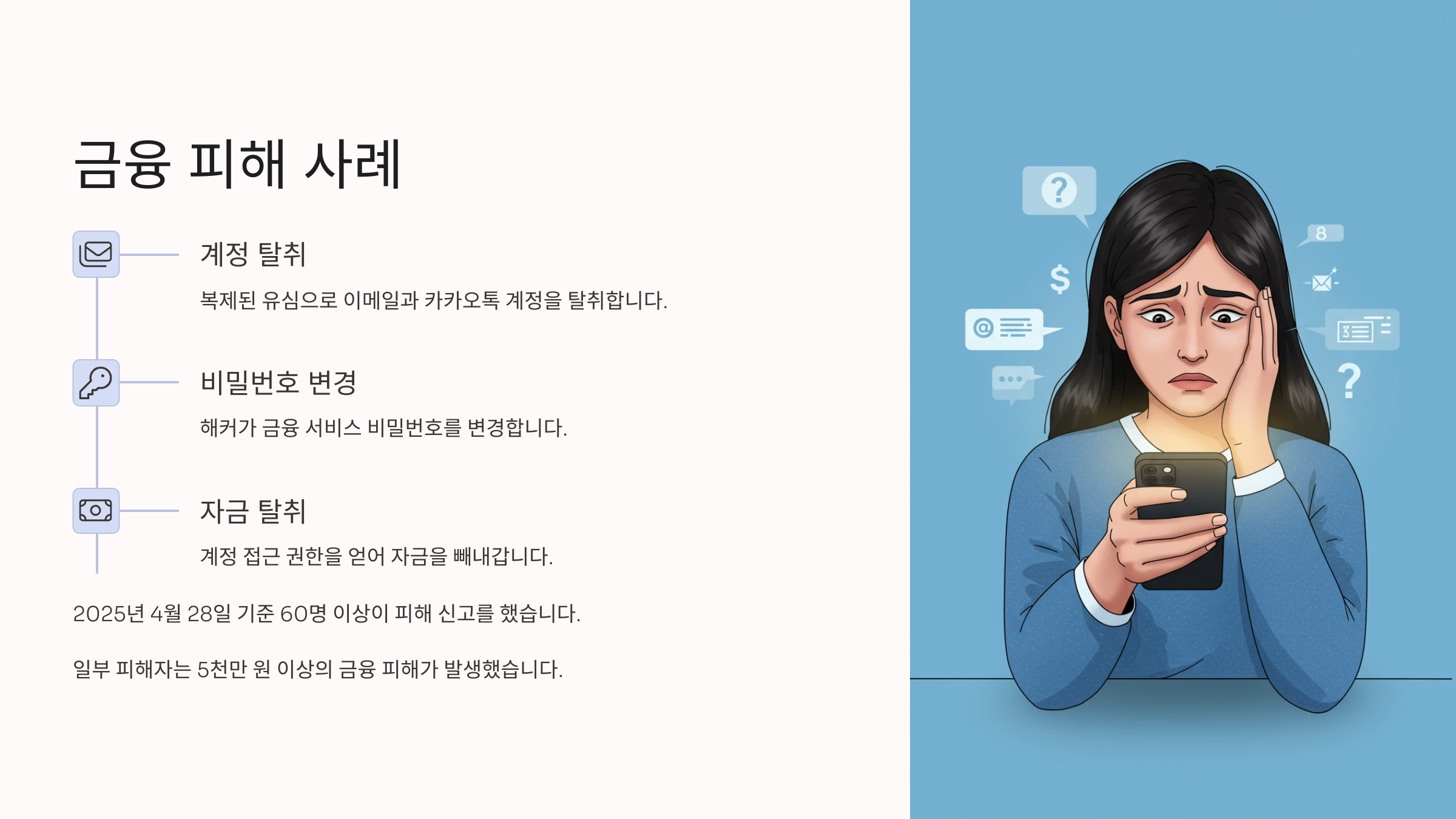 - 개인정보 추가 탈취: 휴대폰 번호로 연동된 계정들의 비밀번호 재설정 등을 통해 추가 피해가 발생할 수 있습니다.